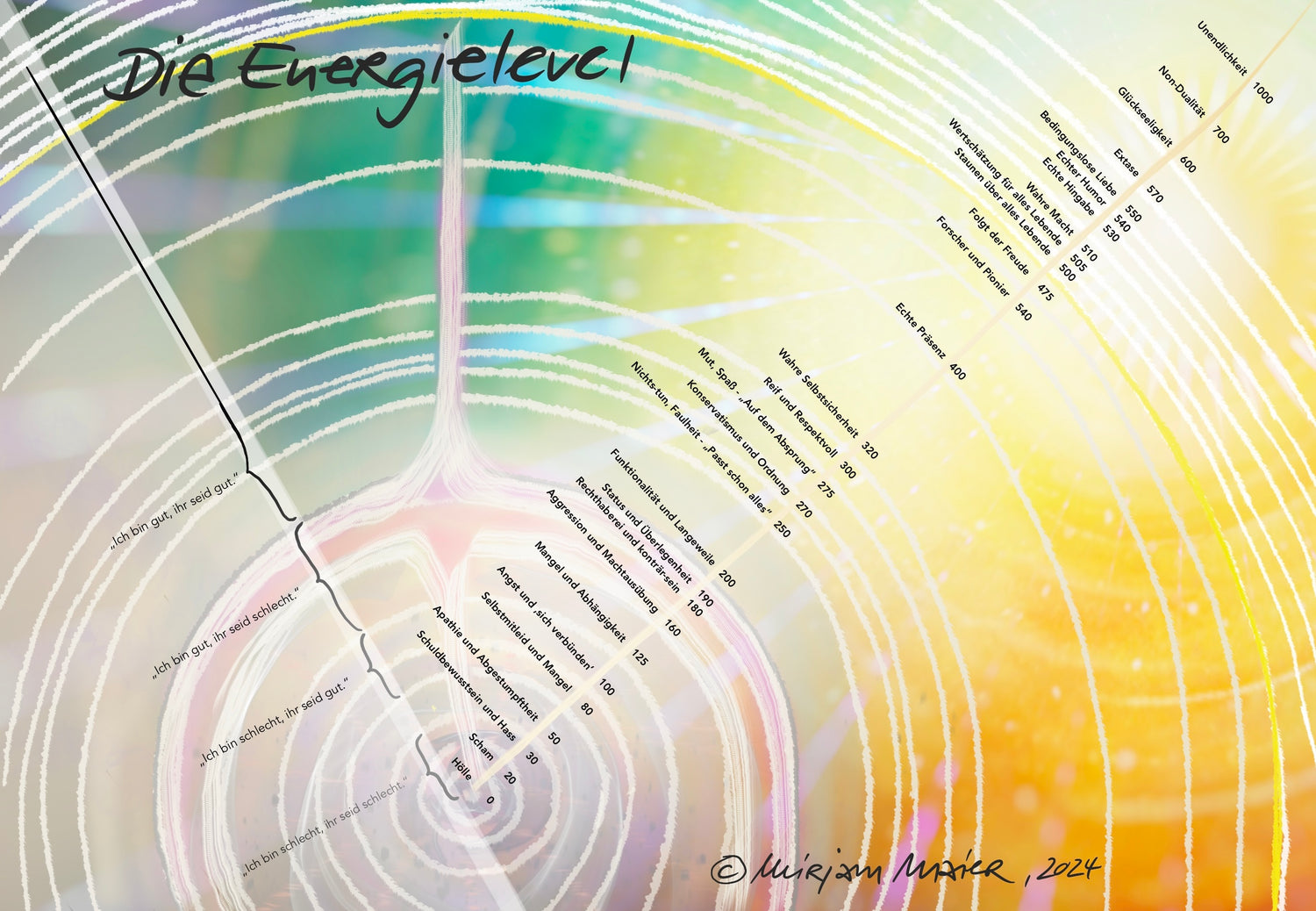 Ganz oben steht das Energielevel 1000: Leichtigkeit, innerer Frieden, das tiefe Gefühl, dass alles gut ist und du dich jederzeit verändern und frei bewegen kannst – dorthin, wo du wirklich hinmöchtest.